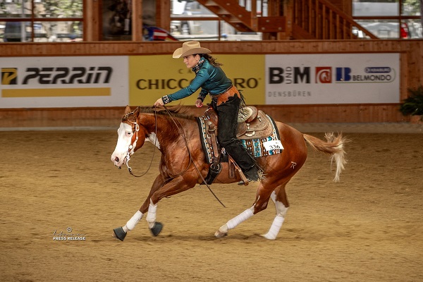 Die Schweizerin Adrienne Speidel ritt mit ihren beiden Pferden Wimpysshortstride BB (NRHA Twelve Million Dollar Sire Wimpys Little Step x Short Rooster) und CDC Cromed Resolve (Custom Del Cielo x Kaysolve) eine Wertung von 217,5 und teilte sich damit zusammen mit Francesca den Reservetitel auf ihren beiden Pferden.